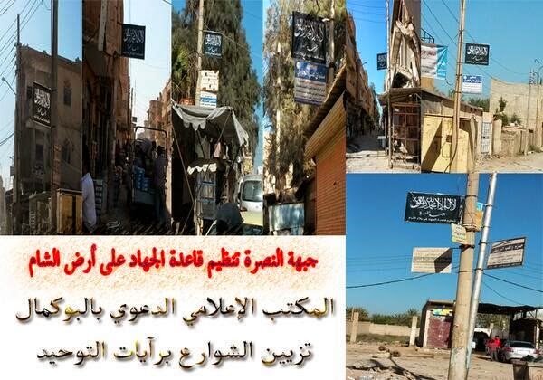 | JN signposts in various parts of Abu Kamal, illustrating the group’s influence: “The da’wah media office in Abu Kamal: decoration of the streets with banners of Tawhid.” |